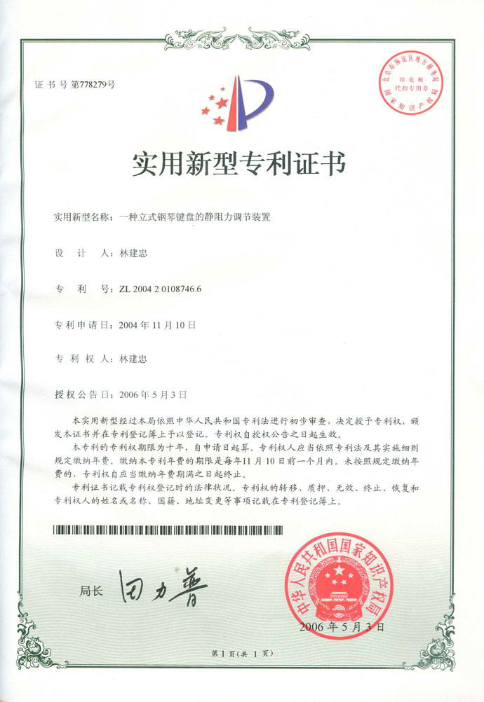 一种立式钢琴键盘静阻力调节装置(实用新型专利,专利号:ZL 2004 2 0108746.6) 2018-06-28 09:34:13