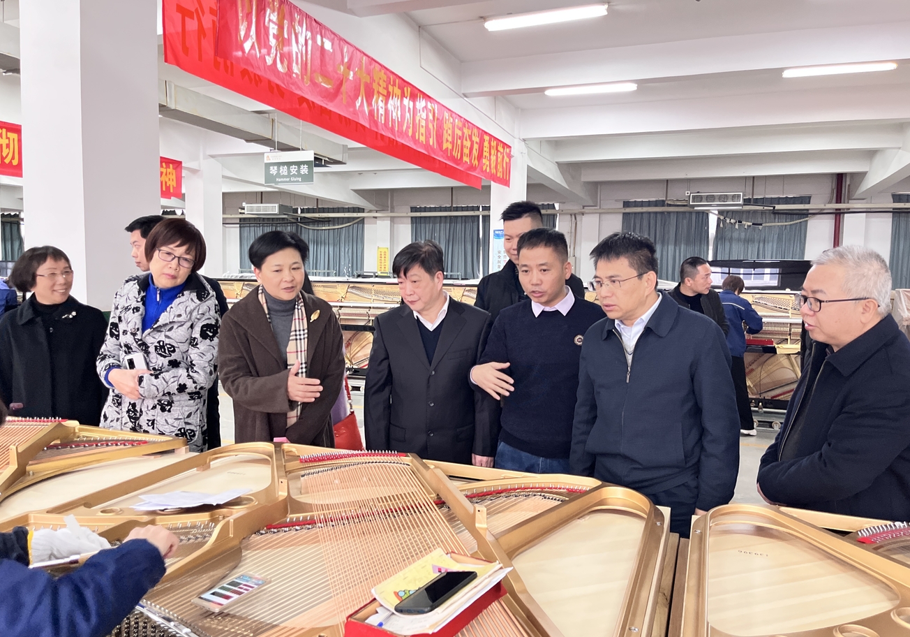 随后,考察组一行实地考察了恒温恒湿生产车间和钢琴展厅,深入了解和声钢琴生产工序、技术工艺、产品品质等情况,对公司的厂容厂貌、品质管控、新品研发等给予赞赏和充分肯定,同时希望和声钢琴公司能够发挥自身优势,主动融入福建文旅经济发展,打造独具特色的本土钢琴文化传播体系。当天,考察组向公司选购10台钢琴用于民盟“烛光行动”捐赠龙岩漳平市城北小学。